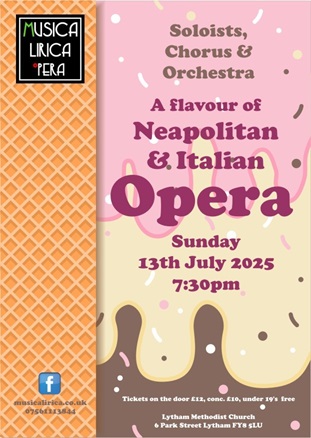 Sunday 17th November at 7:30pm at the White Church Lytham, tickets on the door. An action packed evening of opera with MLO singers and orchestra plus special Italian guests: Sonia Sciamanna, soprano and Stefano Grassi, tenore.